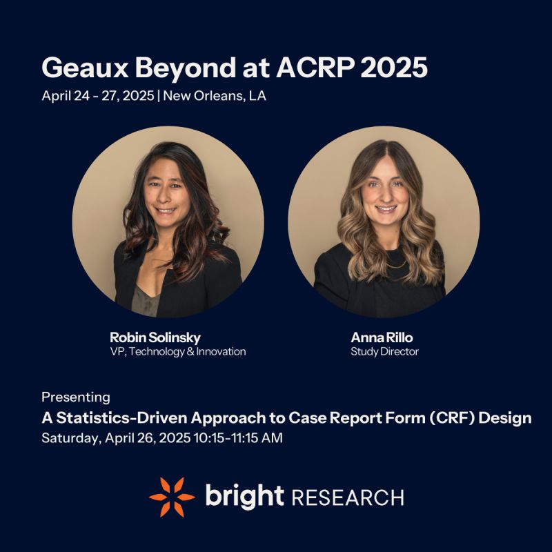 Don’t miss Robin Solinsky and Anna Rillo, BSN, RN as they present “A Statistics-Driven Approach to Case Report Form (CRF) Design” on Saturday, April 26 from 10:15-11:15 AM at Geaux Beyond ACRP – Association of Clinical Research Professionals 2025. They’ll share insights that can elevate your ACRP 2025 CRF design and streamline study design.
